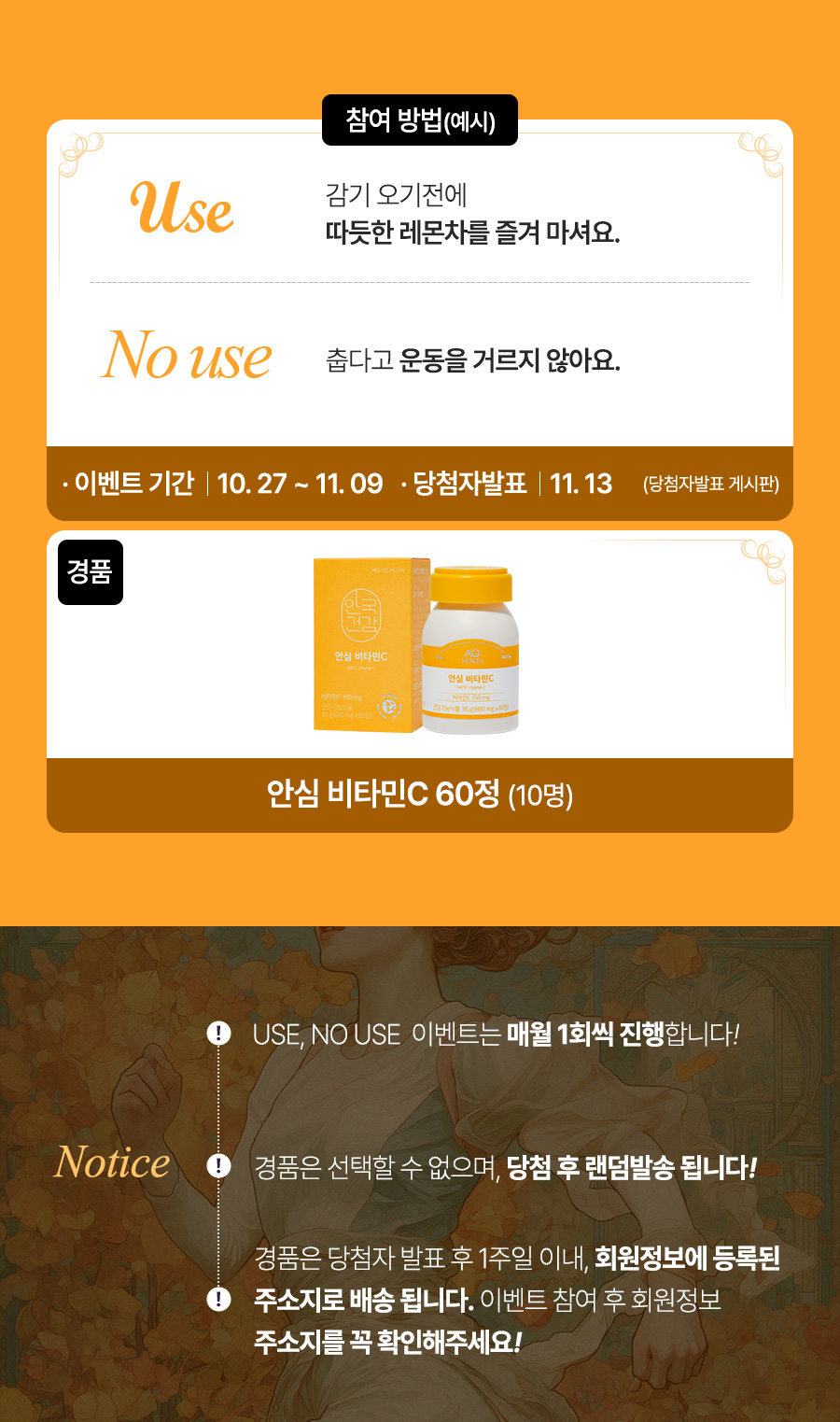 USE : 찬바람 불청객인 감기를 예방하기 위해 열심히 비타민, 유산균, 오메가, 홍삼 챙겨먹어요.
