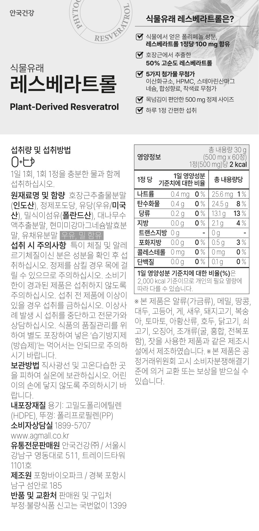 [1+1][유즈노유즈] 식물유래 레스베라트롤 *호장근추출물 항산화 고순도 60정 2박스 (4개월분)